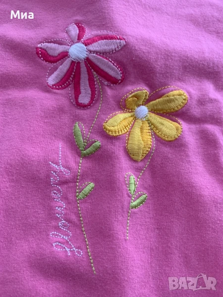 1. Розова тениска с къс ръкав и апликация цветенце, размер 36месеца/ 98см, с копченца тик так отзад, цена 15лв