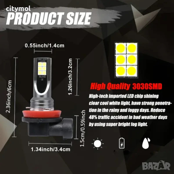 LED лампи H8 / H9 / H11 за халоген, фарове, дневни светлини - 2 броя