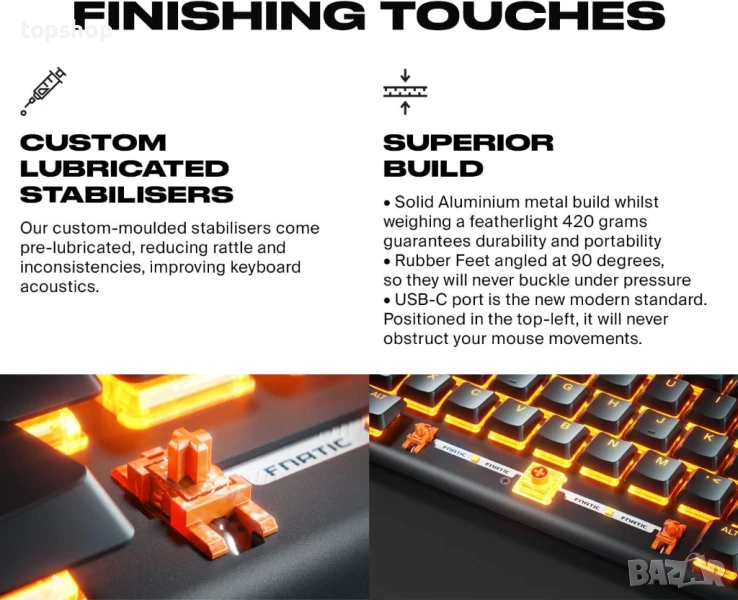 СЪЗДАДЕНО ОТ FNATIC, ЛИДЕРИТЕ В ЕЛЕКТРОННИТЕ СПОРТОВЕ: Fnatic е лидер в професионалното движение за електронни спортове. Нашите професионални геймъри са спечелили хиляди турнири в 20 различни игри, включително League of Legends, Dota 2, Rainbow 6 Siege и CS:GO. Ние проектираме нашето първокласно геймърско оборудване, като сме взели предвид обратната връзка от нашите професионалисти, за да сте сигурни, че получавате най-доброто качество.