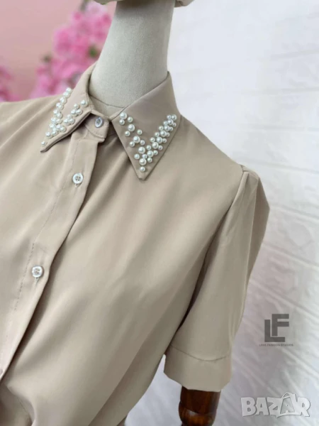 Кройка: Кройката е свободна, права, с ефектна яка декорирана с перли