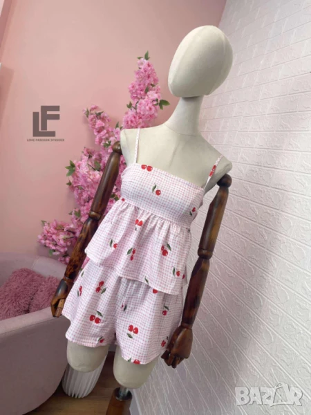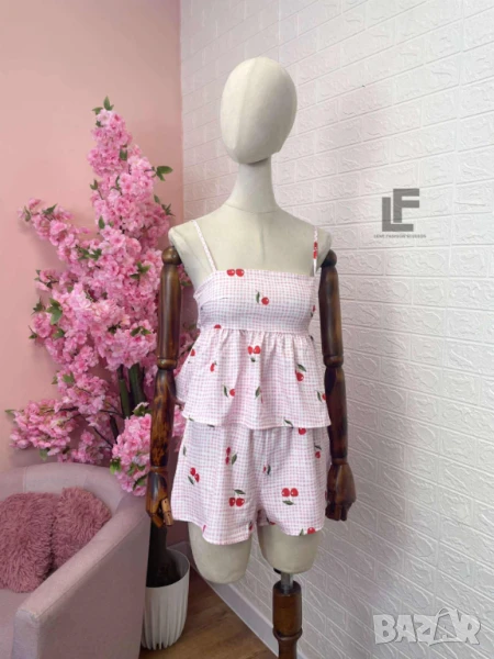 Кройка: Кройката на топа е свободна, с коригиращи се презрамки, ластик и коригиращи връзки на гърба. Кройката на панталонките е свободна с ластик на кръста, висока талия.