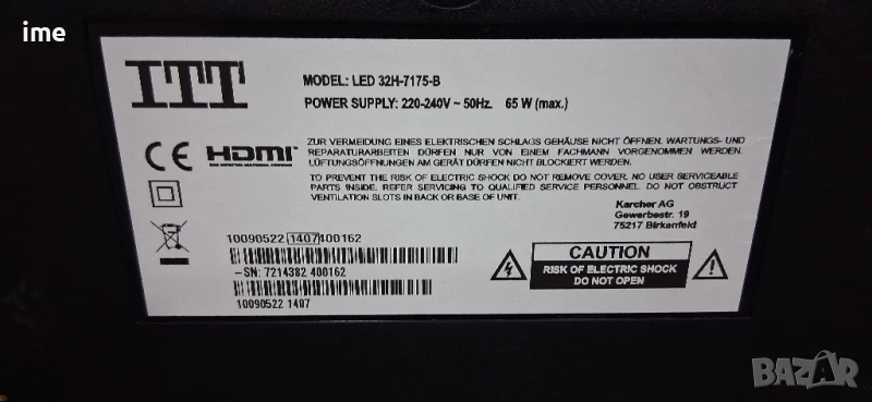 LED телевизор НОМЕР 34. ITT. Model LED-32H-7175-B. 32 инча, 81 см. Цифров и аналогов тунер.. → Обява 50579594