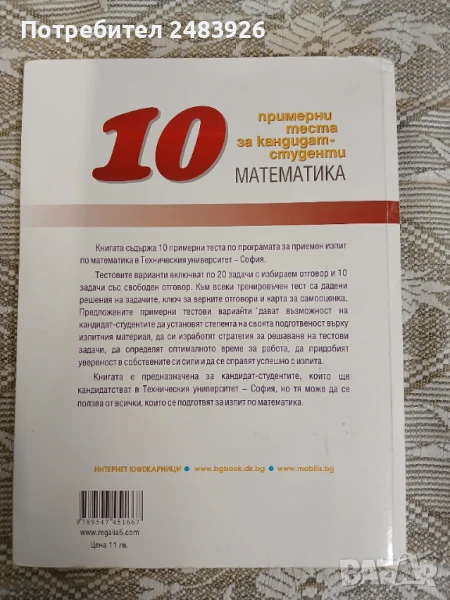 съдържа 10 примерни теста по програмата за приемен изпит по математика в