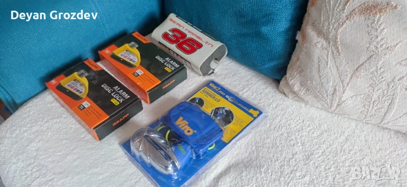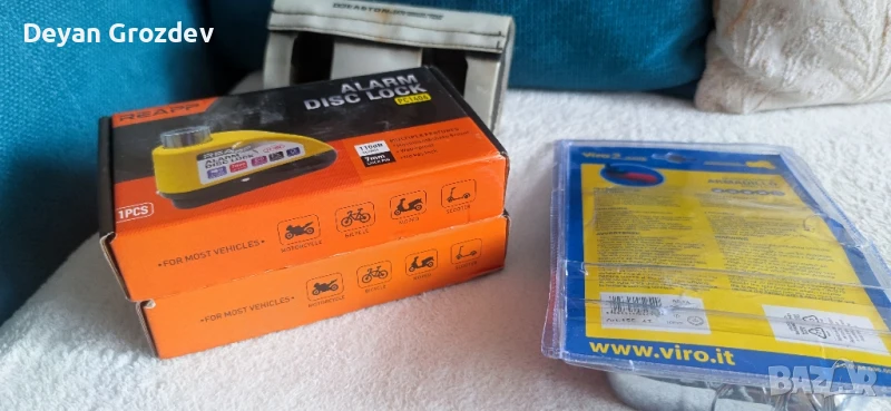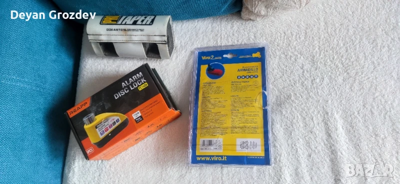 Заключване с аларма за всички видове мотоциклети и скутери. Цената е 55лв за брой. Кросбар за кормило ползван 30лв.
