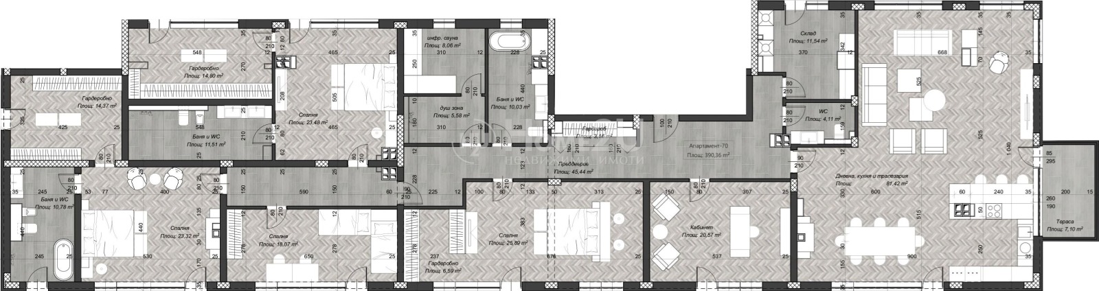 входно антре, хол + кухненски бокс 81.42кв.м., четири спални, три гардеробни, Сауна и Склад, три бани + тоалетни, отделна тоалетна, панорамна тераса 370.31кв.м.