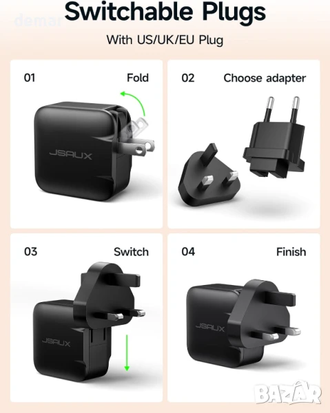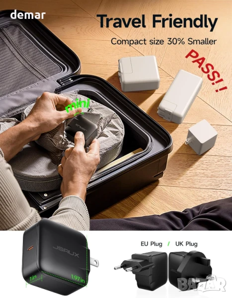 Това бързо зарядно устройство GaN с мощност 65 W предлага мощно и ефикасно зареждане за лаптопи, таблети и игрални устройства, с универсална съвместимост с USB-C устройства, включително Nintendo Switch 2, Steam Deck, MacBook и телефони Galaxy. Поддържа международни пътувания със сменяеми щепсели за САЩ, Великобритания и ЕС, както и сгъваем дизайн за преносимост. Включен е 2-метров оплетен USB-C към USB-C кабел, който поддържа бързо зареждане и пренос на данни. Вградените защити предпазват от пренапрежение, свръхток и късо съединение, а GaN технологията поддържа зарядното устройство компактно и ефективно.