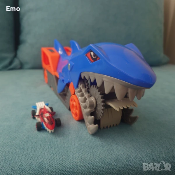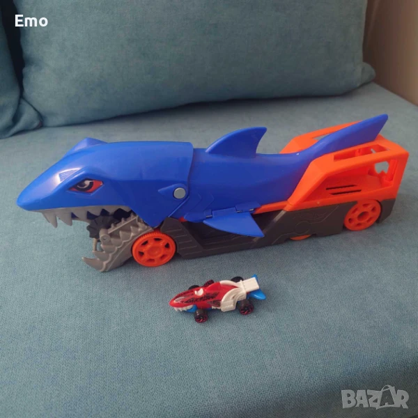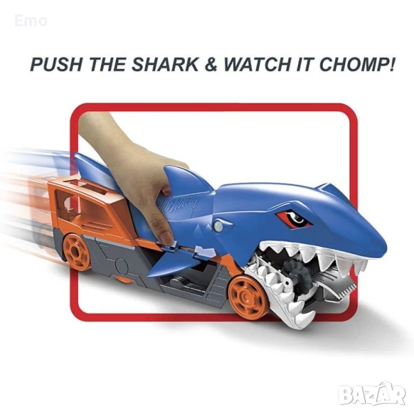 Невероятен автовоз преминава по улиците на Hot Wheels City. Това е голяма акула, която пропуска количките да минат през огромната й уста! Усетете адреналина и се забавлявайте истински с комплекта с една количка на Hot Wheels City.Този супер готин автовоз, вдъхновен от акули, поглъща автомобили и ги съхранява в корема си за уникален и забавен начин за транспортиране и съхранение на превозни средства Hot Wheels. Тази по-голяма версия на емблематичната кола Shark Bite Hot Wheels има разпознаваемите черти на любим враг на децата - изходна рампа отзад изстрелва колите към следващото им приключение.Транспортното превозно средство Hot Wheels Shark Chomp идва с една кола Shark Bite Hot Wheels и може да побере до още четири. Комплектът за игра Hot Wheels® Shark Truck трансформира легендарното превозно средство Hot Wheels® Shark в камион. Благодарение на специалния механизъм, който се задейства при натискане, акулата хваща коли с челюстите си и ги прибира в корема си. Трябва да разтоварите? Има изходна рампа отзад за лесен достъп.