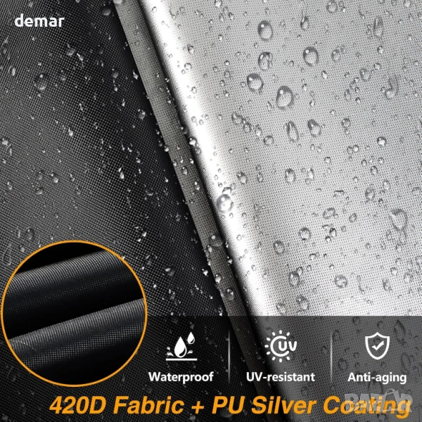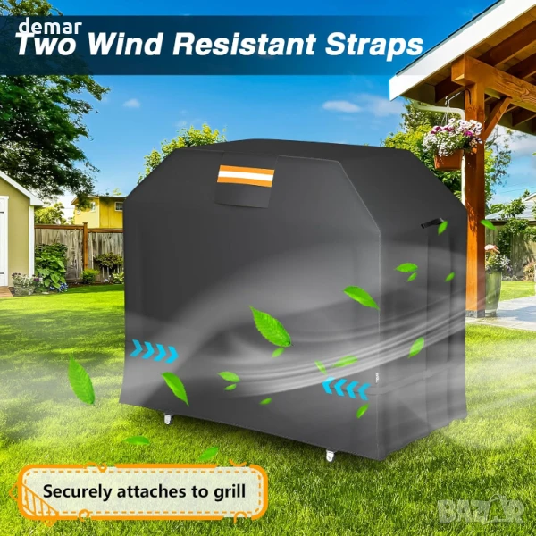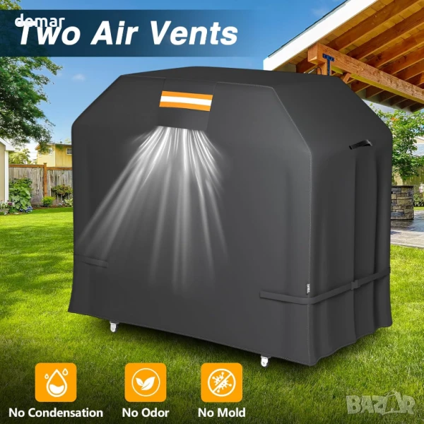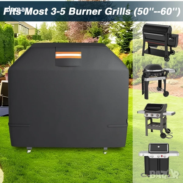 Този калъф за барбекю грил е изработен от издръжлив, водоустойчив 420D найлон с PU сребристо покритие за подобрена UV и водоустойчивост. Разполага със странични вентилационни отвори за предотвратяване на миризми и мухъл, светлоотразителни ленти за видимост през нощта и ветроустойчиви ленти, които го предпазват по време на бури. Проектиран да е съвместим с повечето грилове с 3–5 горелки от големи марки, той е лесен за почистване с просто избърсване и предлага защита при всякакви метеорологични условия от дъжд, сняг, прах и слънце. Винаги се уверявайте, че грилът е хладен, преди да го покриете. Размери 149Д x 122Ш x 63В сантиметра.