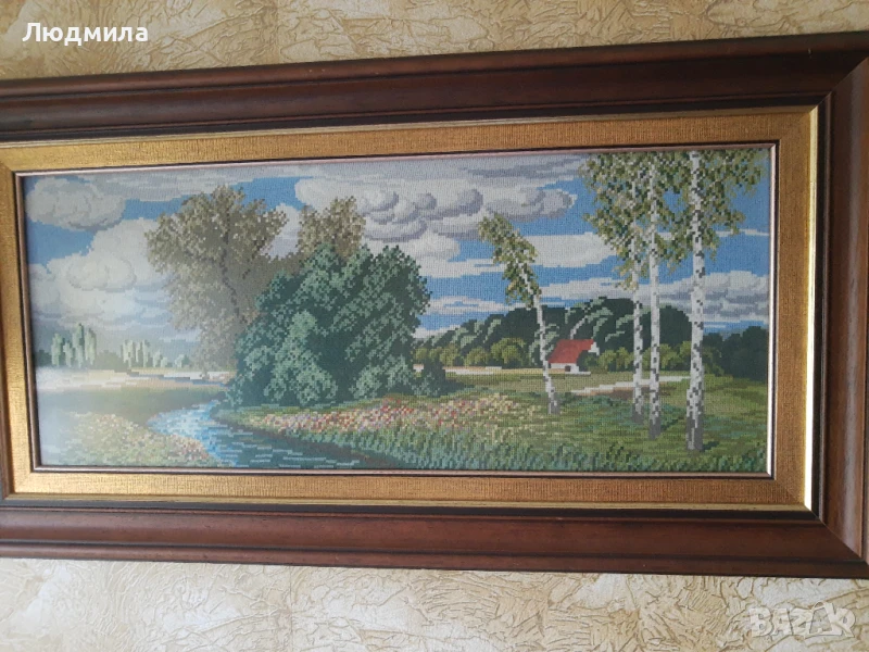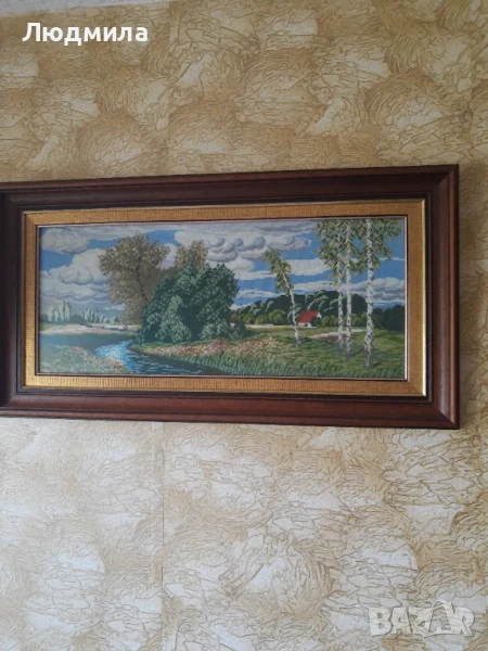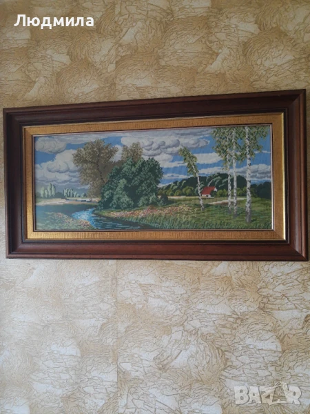 Продавам ръчно изработен гоблен от Вилеровият каталог, "ПОТОКА"Поставен в рамка от дърво,а не пластмаса.В кафяв цвят и позлатен кант.Олекотено ,антирефлексно стъкло,антистатично.Отлична,ръчна изработка ,оригинална схема и конци.Перфектен.Подходящ за дома или за подарък.Уникален.Отлично качество.Подходящ също за подарък за юбилей,пенсиониране и други празнични поводи.Бижу за Вашия дом и много поводи..Моля без бартер.Негативни мнения не ме интересуват.