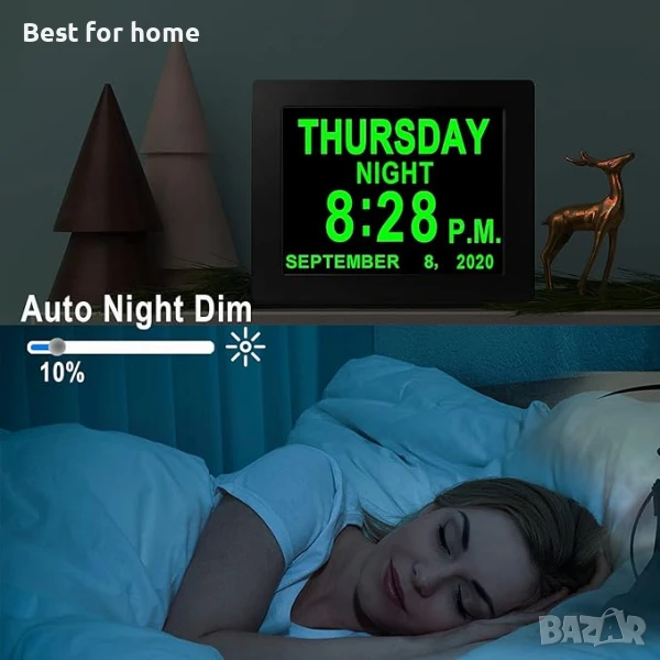 АВТОМАТИЧНО ЗАТЕМНЯВАНЕ: По-лесно настройване на яркостта и контраста. 8-инчов 1024/768 HD LCD цифров часовник с календар показва точното време на голям, ярък и ясен дисплей, който може да се види от другата страна на стаята. Неговият смел, остър и матов дисплей е безценен за хора с увредено зрение и възрастни хора.