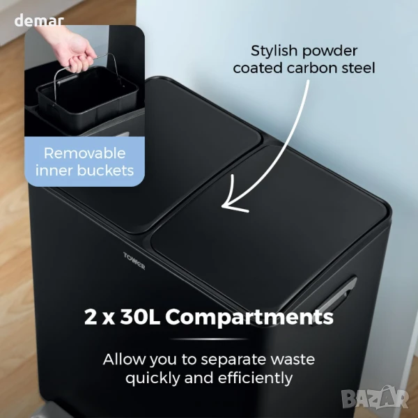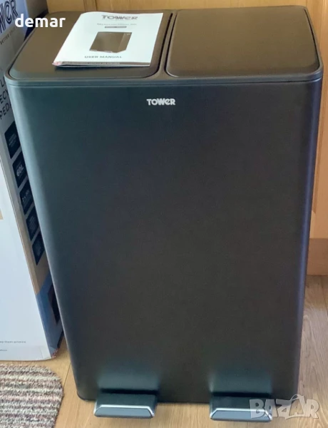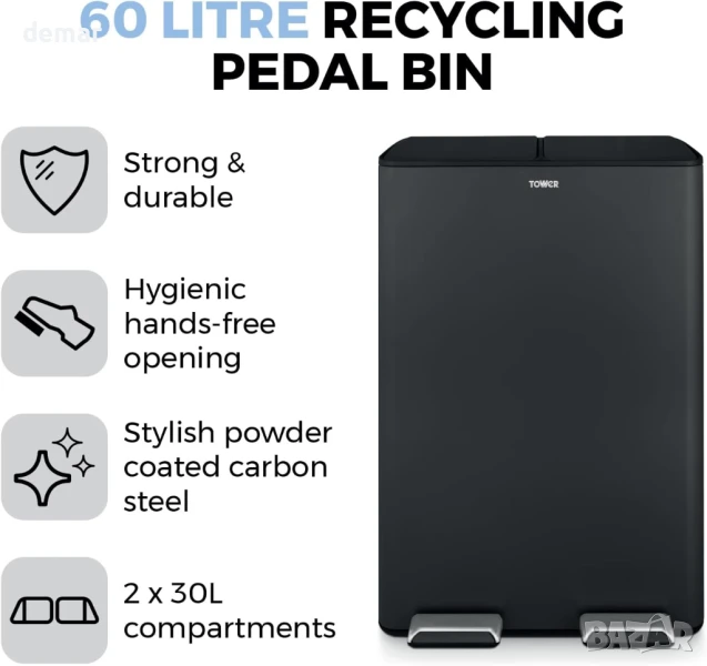 Кош за рециклиране Tower T838023BLK с педал, две отделения по 30 литра, 60 литра, черен