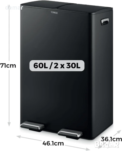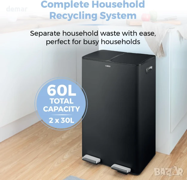 Този кош за рециклиране с обем 60 литра разполага с две отделения по 30 литра за лесно разделяне на отпадъците, което го прави идеален за натоварени домакинства. Всяко отделение има собствен педал за хигиенична употреба без ръце. Изработен от издръжлива въглеродна стомана с елегантно черно прахово покритие, той е създаден за дълготрайна употреба и е подходящ както за модерен, така и за традиционен интериор.