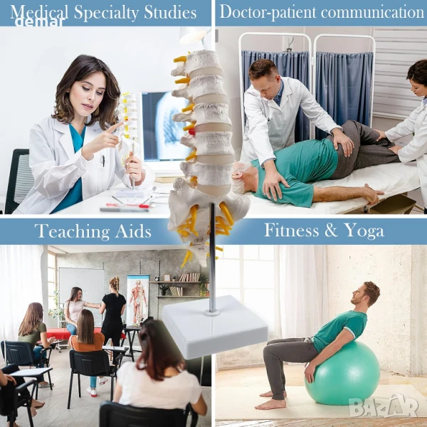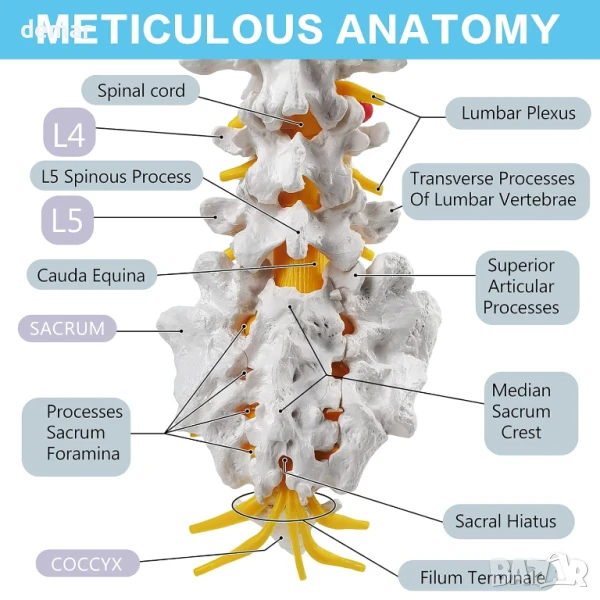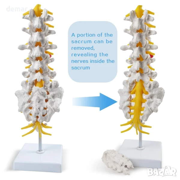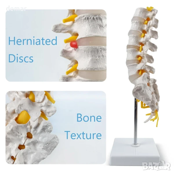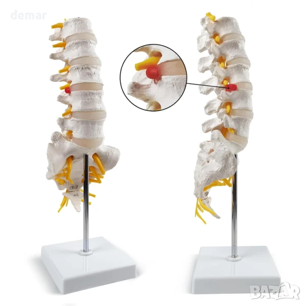 Този модел на лумбалния отдел на гръбначния стълб в реален размер включва пет прешлена, междупрешленни дискове, гръбначен мозък и видими нерви, включително дискова херния за детайлно изучаване. Проектиран е за преносимост с подвижна стойка и части, което го прави идеален за употреба в класната стая или обучение на пациенти. Изработен от издръжлив, нетоксичен PVC, лесен е за почистване и е издръжлив, със стабилно изправено позициониране и магнитни конектори за лесно сглобяване.