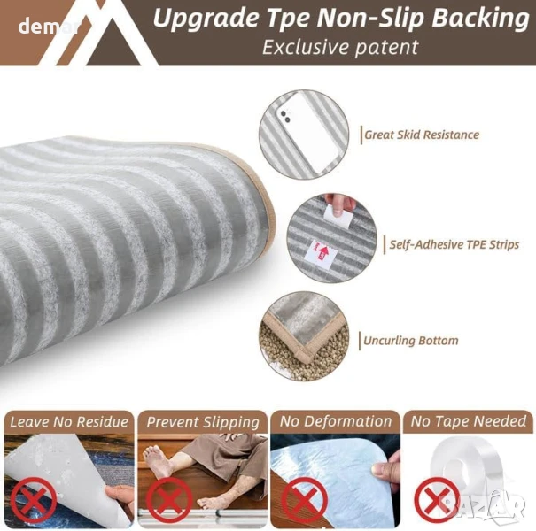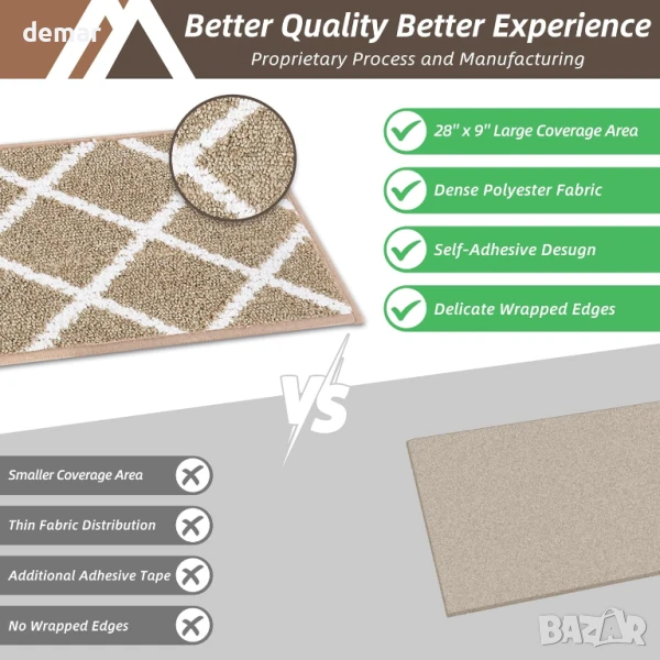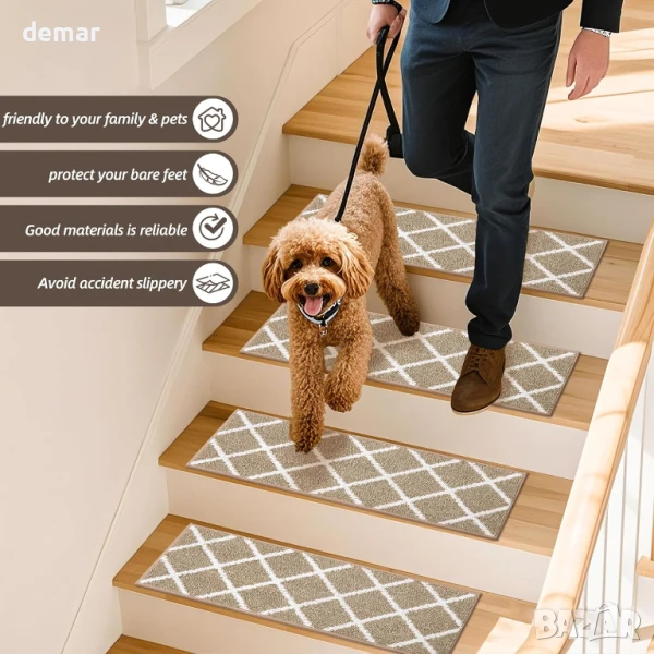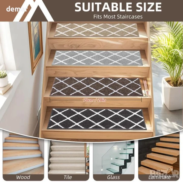 Тези вътрешни подложки за стълби са с размери 70 x 22 см и са изработени от мек, издръжлив 100% полиестер с неплъзгаща се TPE подложка, която предотвратява изместване и навиване – идеални за стълби от твърда дървесина, плочки, ламинат или стъкло. Те предлагат тиха, омекотена повърхност, която е безопасна за деца, домашни любимци и възрастни хора. Фините шевове и дебелите влакна спомагат за намаляване на шума и подобряване на комфорта под краката, а модерният дизайн добавя декоративен щрих. Могат да се перат в пералня и са устойчиви на избледняване, те са създадени за дългосрочна употреба без компромис с външния вид или безопасността. (Моля, обърнете внимание: използвайте препарат с неутрално pH и не използвайте сушилня).