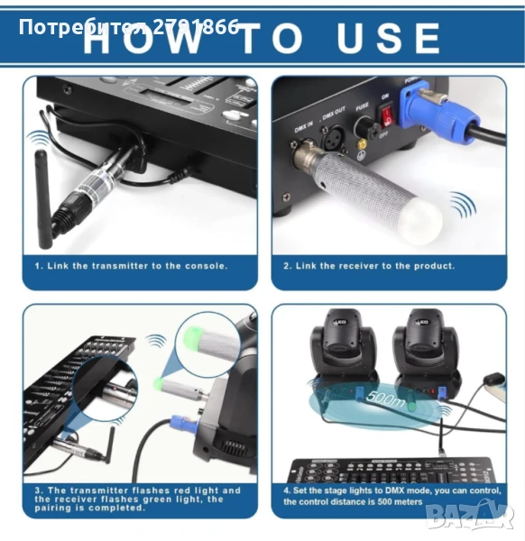 DMX512 безжичен приемник с вградена батерия 2 броя DMX контролер за движеща се глава диско светлина