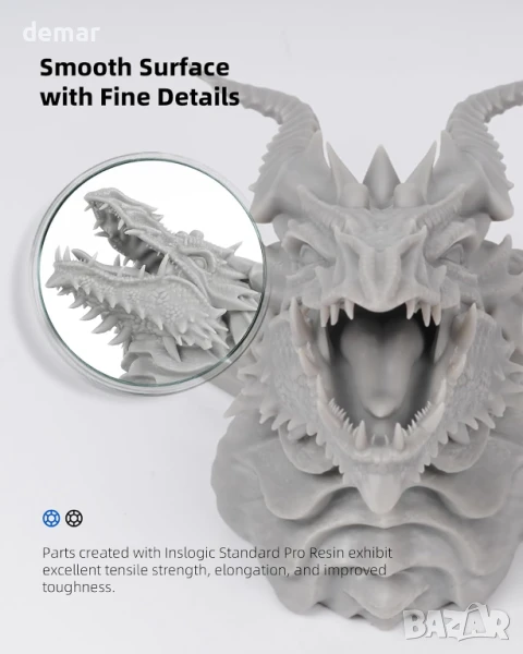 Inslogic Standard Pro Resin предлага бързо втвърдяване с минимално свиване за прецизни, висококачествени разпечатки. Ниският му вискозитет осигурява плавен поток и стабилност, като същевременно осигурява фини детайли на повърхността, които опростяват последващата обработка. Лесен за употреба със силна адхезия и намалено образуване на мехурчета, той е съвместим с повечето DLP, SLA и LCD 3D принтери (385–405 nm) и поддържа слаба миризма за по-комфортно изживяване при печат.