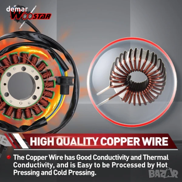 Съвместима със Suzuki VZ800 Marauder 800 (1997–2004) като заместител на OEM 32101-48e00, тази част е с издръжлива метална ламинирана конструкция с медна намотка за здравина, устойчивост на ръжда и дългосрочна надеждност. Проектирана за лесен монтаж, тя включва точни размери - вътрешен диаметър 42 мм, външен диаметър 103 мм и подробни спецификации за монтаж. Винаги проверявайте модела и размера преди покупка.