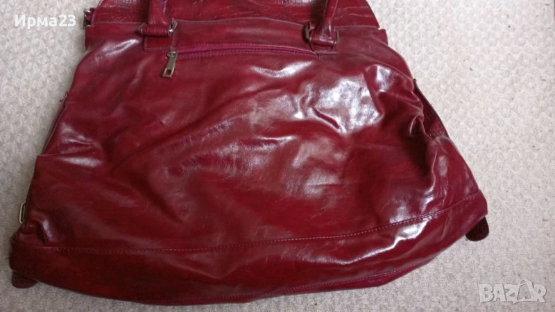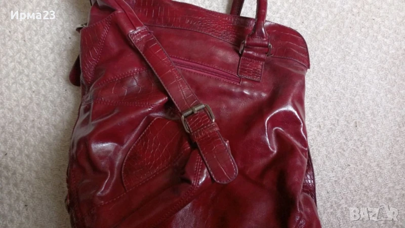 Червена кожена чанта тип трапец с размери 37см на 48см и височина 37см