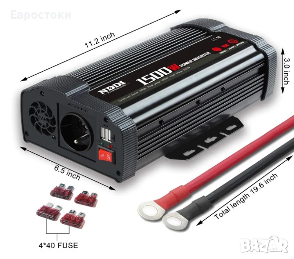 Инвертор NDDI POWER 1500 W преобразувател на напрежение 12 V към 230 V, 3.1 A двоен USB порт, инвертор за кола, каравана, къмпинг, мобилни устройства