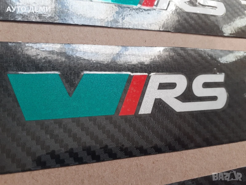Продавам гланцирани самозалепващи стикери за прагове и броня на автомобил с надпис на VRS.