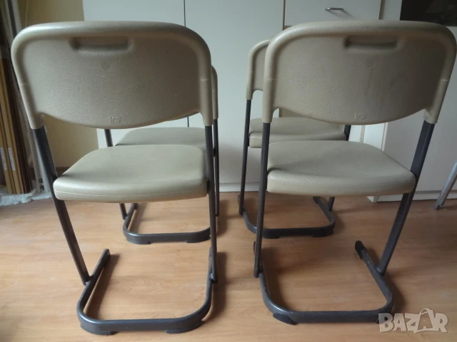 Комплект от 4 бр. градински стола от Германия. Столовете са много здрави и масивни с метална конструкция и седалки от закалена твърда пластмаса. Могат да се ползват и от деца, понеже са по-ниски от трапезните столове с 10 см. Предназначени са за сядане до по-ниска кафе маса например или за детско събиране или детски празник. Подходящи са за къмпинг или като рибарски столове поради по-малките си размери. Издържат тегло от 120 кг. Столовете влизат един в друг и не заемат много място при съхранение или транспортиране. Продават се само заедно като комплект за 140 лв.