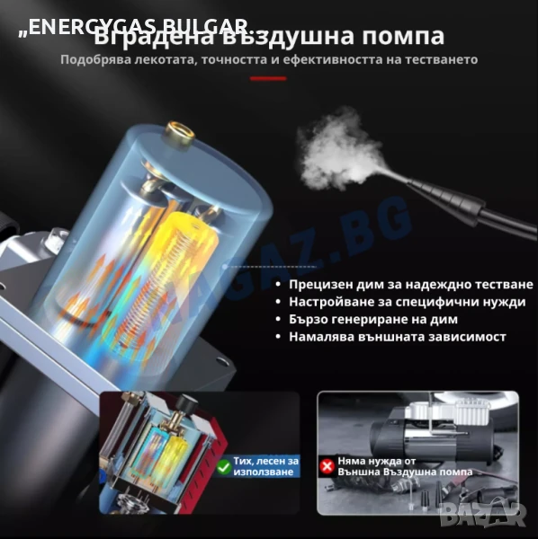 Два режима на работа – Превключвател за въздушен режим, независимо контролирана вградена въздушна помпа. Превключвател за режим на дим, независимо контролиран генератор на дим. Димът може да бъде произведен в рамките на 30 секунди, което значително намалява времето за диагностика.