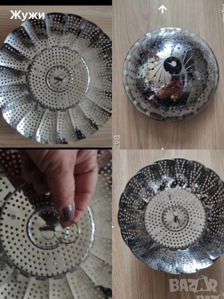 НОВИ пепелници цена за брой 1,50 лв. ПОСТАВКА за готвене на пара може да се използва и като капак за тиган против пръскане може да се използва и като фруктиера сгъва се и става малък и компактен цена 4,50 лв. СЛЕДВА нова метална поставка за шишета цена 7,90 лв. НОВИ ножове два броя цена за брой 2,50 лв