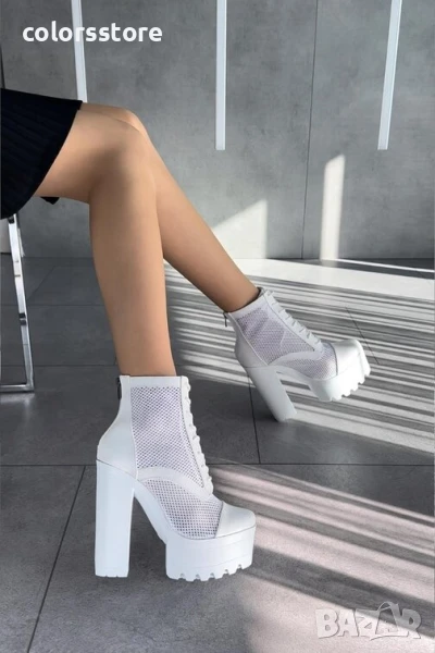 Летни боти на ток - бяла кожа с мрежа - 74-2