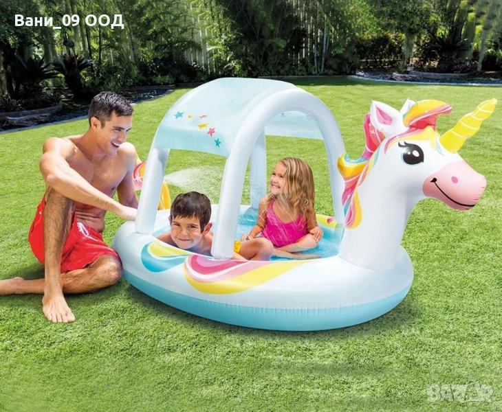 Детски надуваем басейн с форма на Еднорог, със сенник и функция пръскалка за допълнително разхлаждане.