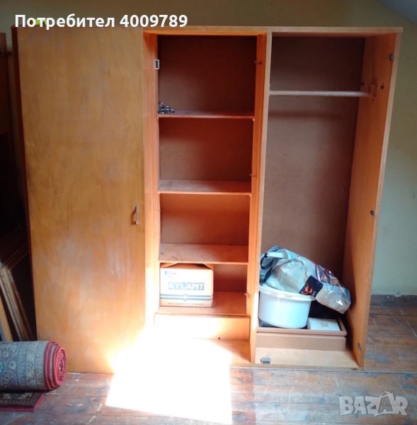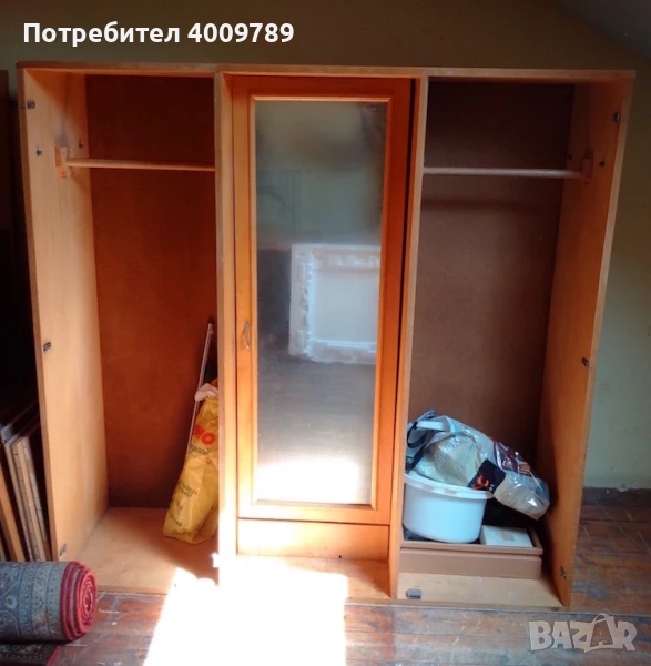 Продава се трикрилен гардероб с огледало и надстройка от масивно дърво. Обявената цена е и за двете части.