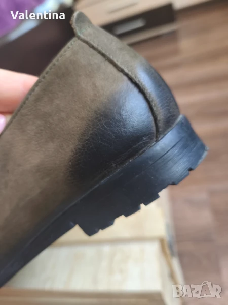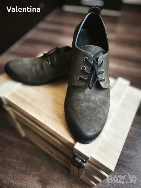 Предлагам дамски обувки тип Оксфорд в маслено зелен цвят, от естествен велур. Обувани са 2 пъти. Имат ефект отпред и отзад, видим на снимките. В отлично състояние. Размер на обувката - 37 номер.
