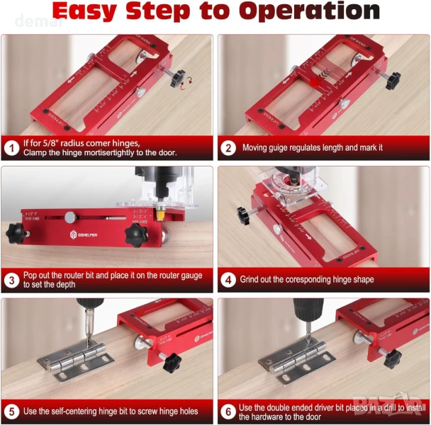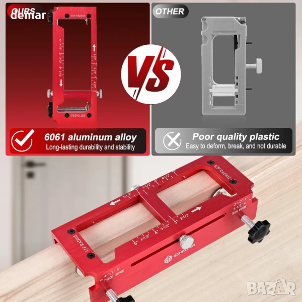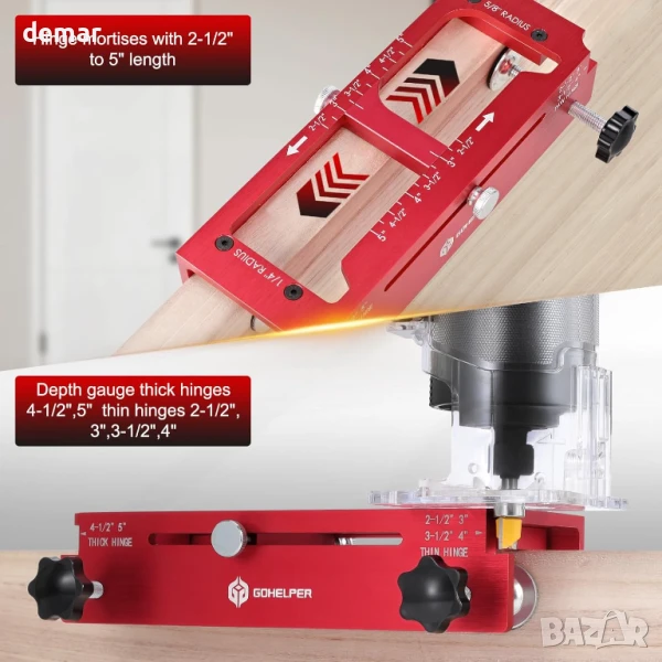 Този шаблон за панти за врати е подходящ както за кръгли, така и за квадратни панти, като реже вдлъбнатини с дължина от 2-1/2” до 5” (само за употреба с врати). Включва вграден дълбокомер за различни размери панти и се предлага със самоцентриращ се накрайник, накрайник за отвертка и противоплъзгащи подложки за точност и стабилност. Изработен от издръжлива анодизирана алуминиева сплав, той е много по-устойчив на огъване от пластмасовите алтернативи. Лесен за употреба както от начинаещи, така и от професионалисти, комплектът се предлага с всички основни инструменти, необходими за прецизен и безпроблемен монтаж на панти.