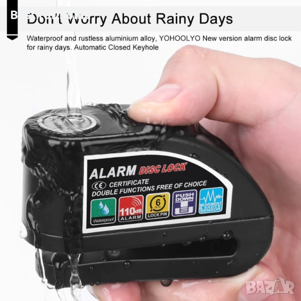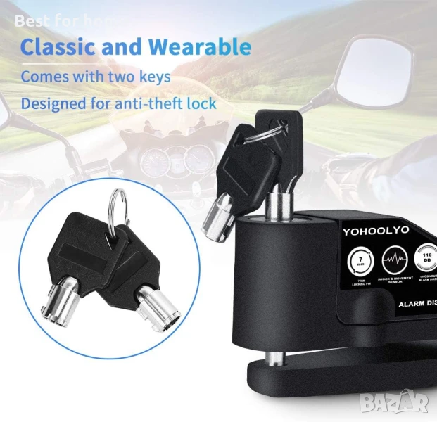 (Накарайте крадците да се страхуват от заключване на аларма против кражба) YOHOOLYO заключването с дискова аларма е практично решение за мотористите, за да защитят любимите си мотоциклети или велосипеди, докато паркират навън или у дома. Алармата до 110db ще се активира автоматично при усещане на вибрация или удар.