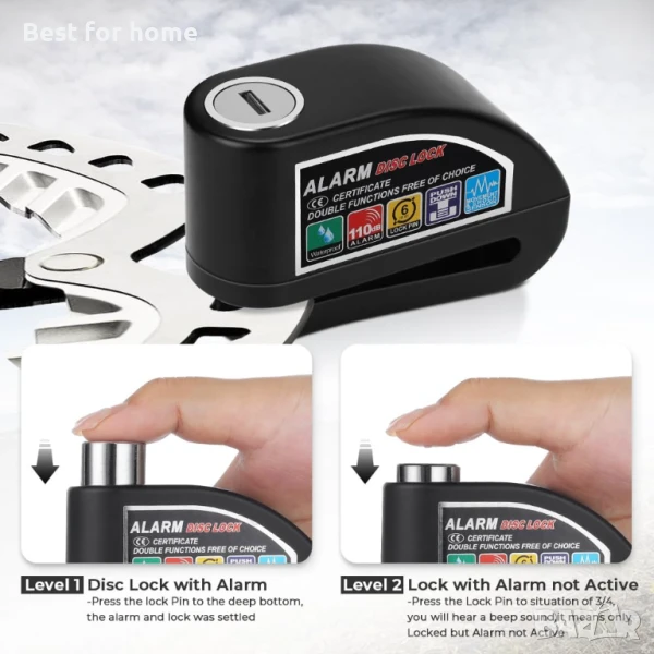 (Устойчива на удар и водоустойчива дискова ключалка) Тази дискова спирачка е изработена от кована неръждаема стомана и се заключва лесно с едно натискане, просто натиснете бутона със звуков сигнал „Beep“ за състояние на аларма. С водоустойчива функция, продължава да работи в дъждовни дни и никога не ръждясва.