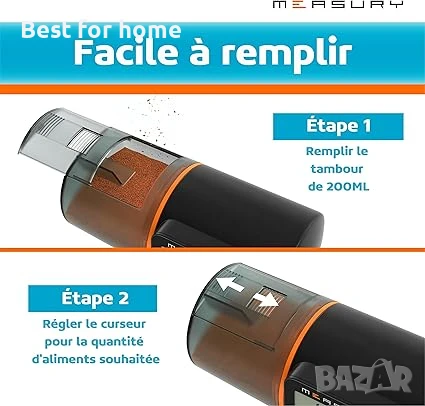 Капацитет 200 мл: Барабанът за храна е с капацитет 200 мл и може да се пълни отгоре с помощта на капак. Плъзгач ви позволява да измервате количеството храна.