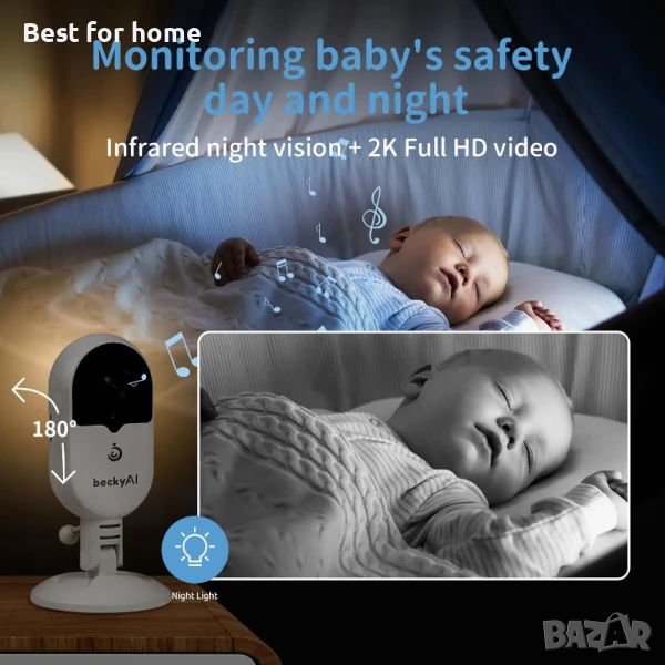 2K HD камера за нощно виждане за бебефон: интелигентният бебефон с 2K Full HD камера може ясно да наблюдава активността на бебето, функцията за автоматично нощно виждане може да осигури висока резолюция и стабилни видео потоци дори през нощта, лесно отговарящи на нуждите на грижата за бебетата през целия ден. Дизайнът с приспивни песнички и успокояващи светлини помага на бебетата да стабилизират емоциите си.