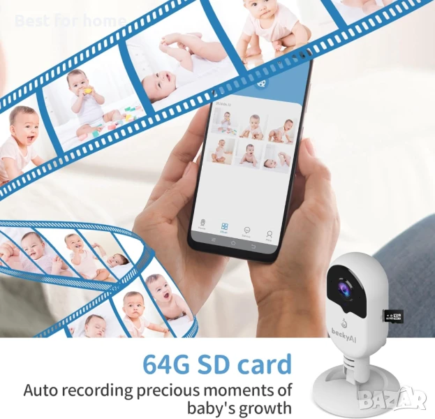 Локално съхранение на SD карта: като бонус е включена допълнителна карта памет от 64 GB, която може автоматично да съхранява снимките и видеоклиповете на вашето бебе. Можете да гледате и възпроизвеждате записаните видеоклипове и снимки директно от приложението и да записвате всеки ценен момент от растежа на вашето бебе.
