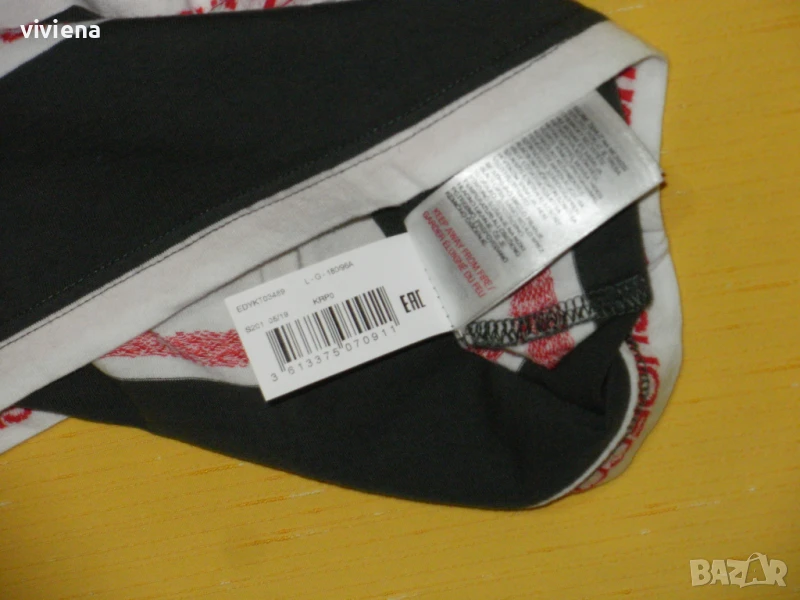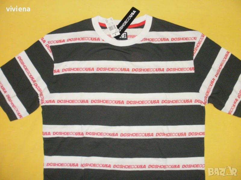 Първата тениска е на DC, оригинална, нова с етикет. Цветовете са бяло, тъмно сиво и червено, много свежо. Материята е тънко трико от 100% памук. По номер е L но е леко уголемена. Дължина-79см. подмишници-56см.
