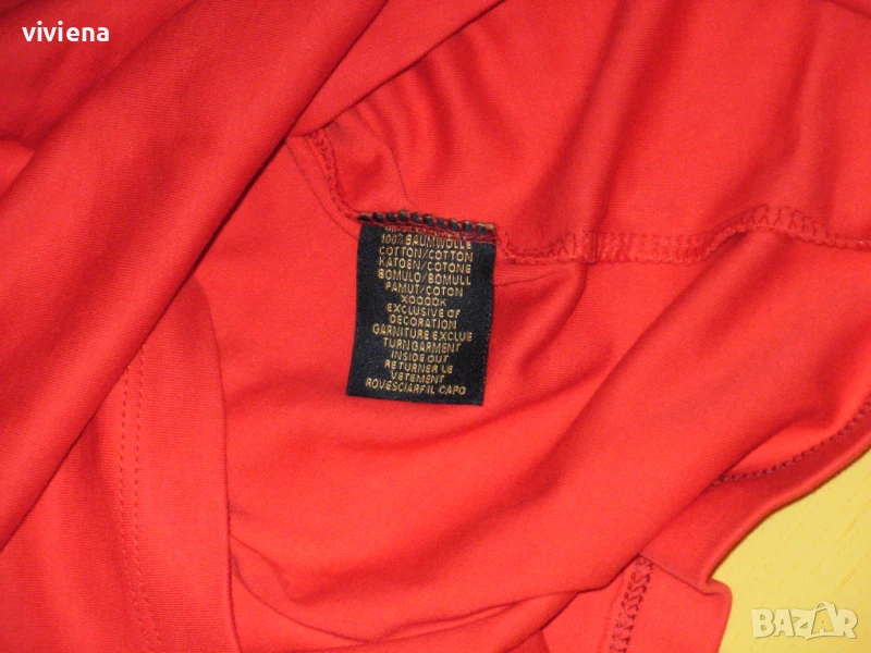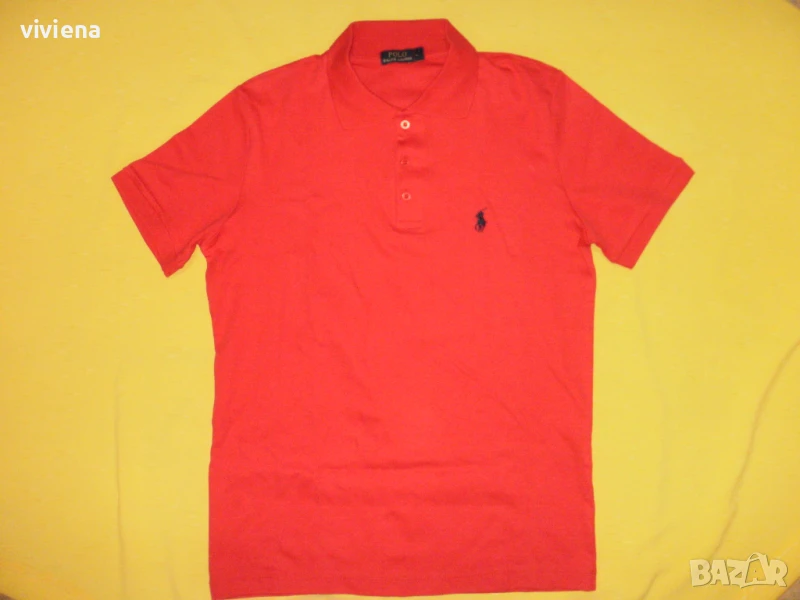 Втората тениска е на POLO Ralph Lauren, оригинална, нова. Цветовета е наситено червено, много свежо. Материята е трико от 100% памук. По номер е L, има лого отпред и на копчетата. Дължина-72см. подмишници-54см.