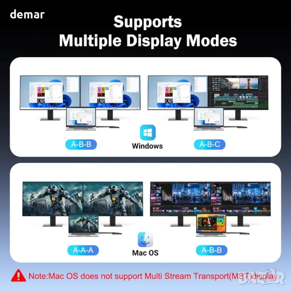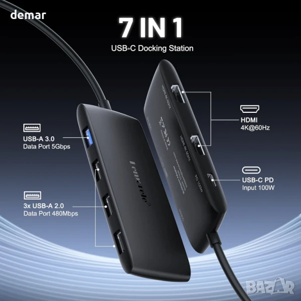 Този хъб разполага с два HDMI порта, поддържащи два 4K дисплея на 60Hz за плавна многозадачност и възпроизвеждане на видео, високоскоростен USB 3.0 порт за бърз 5Gbps трансфер на данни и мощно 100W PD зареждане, за да се захранват ефективно устройствата. Той включва и три USB 2.0 порта за свързване на ежедневни периферни устройства като клавиатури и принтери. Съвместим с всички USB-C устройства, той предлага лесно plug-and-play използване без нужда от драйвери, което го прави идеален както за офис, така и за дома.
