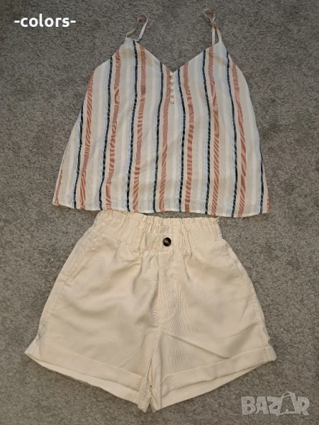 Бермуди талия 30см, дължина 34см.Топ дължина 44см, ширина 39см. С регулиращи презрамки.Нямат етикети, но не са носени.Нямат забележки.