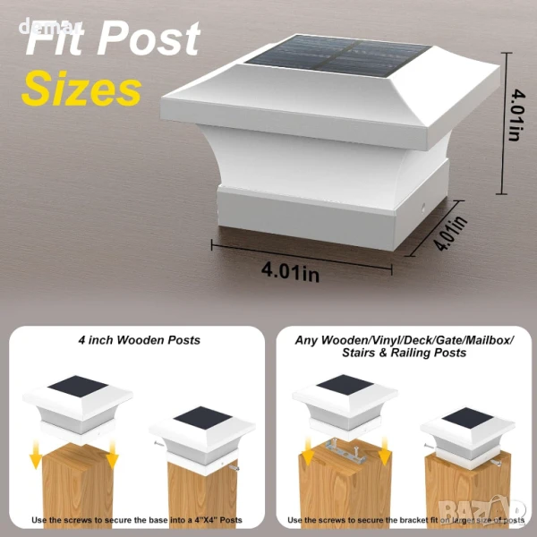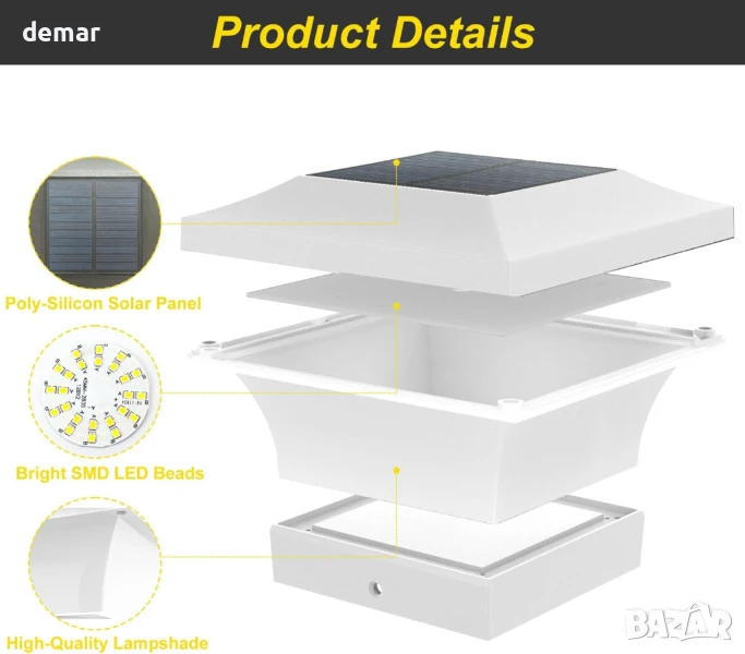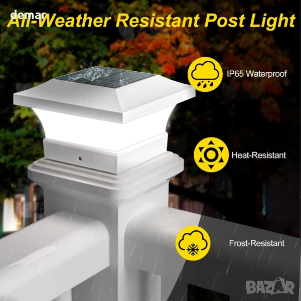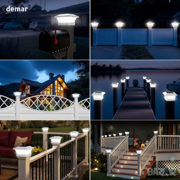 Тази захранвана от слънчева енергия външна лампа разполага с 6 ултра-ярки светодиода, осигуряващи 80–100 лумена, и работи 8–10 часа след 6-часово зареждане. Автоматично се включва привечер и се изключва призори, предлагайки енергийно ефективно осветление без разходи за електричество. Проектирана от издръжливи ABS и PC материали, тя е водоустойчива със степен на защита IP65 и е идеална за градини, огради, порти и коридори. Инсталацията е лесна, без да е необходимо окабеляване – пасва на стандартни дървени стълбове 4" x 4" или стойки с помощта на включената скоба. Размер: 15 x 15 x 9,4 см.