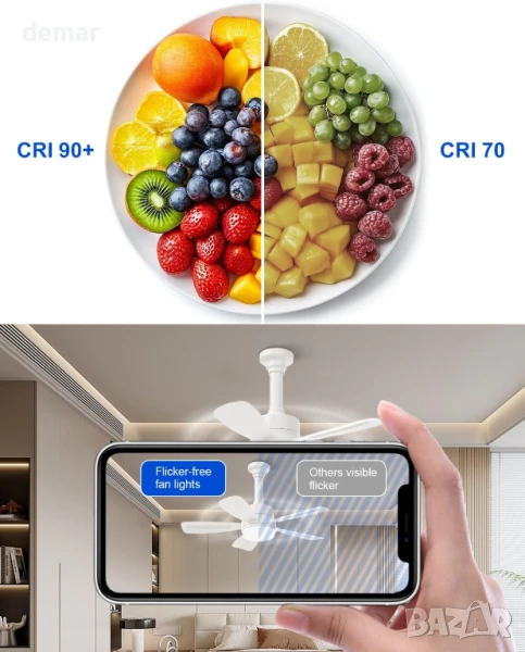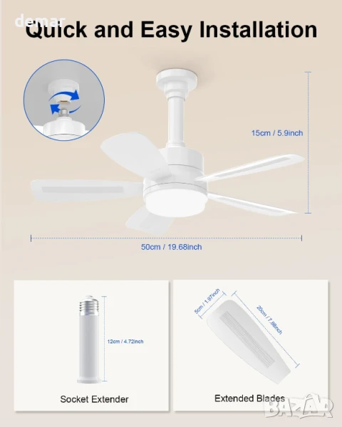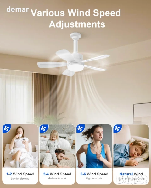 Този таванен вентилатор с вградено осветление е идеален за помещения до 20 кв.м., предлагайки два пъти по-висока скорост на охлаждане от стандартните вентилатори с извити 20-сантиметрови лопатки и мотор с 415 оборота в минута за силен и тих въздушен поток под 30 dB. Той разполага с шест скорости на вентилатора, интелигентен режим за естествен вятър и бутон за безшумно димиране, елиминиращ шума при работа. Димируемата LED светлина осигурява пет режима на осветление, висока точност на цветовете (CRI >90) и изход без трептене, а интелигентният таймер повишава енергийната ефективност. Инсталацията отнема само минути с цокъл E27, което го прави подходящ за различни малки пространства.