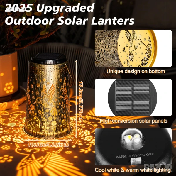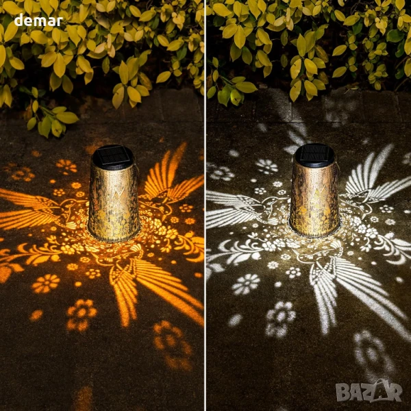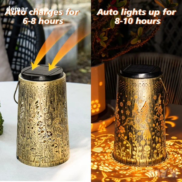 Този подобрен соларен фенер разполага с по-голям, ярък дизайн на колибри, който обогатява градинските или вътрешните дворове с очарователна атмосфера. Изработен от издръжливо ковано желязо с бронзово покритие, той е водоустойчив със степен на защита IP65 и е създаден да издържа на всякакви метеорологични условия. Предлага както топла, така и студена светлина с автоматичен режим на работа от здрач до зори за лесна употреба. Захранван от високоефективен соларен панел, той се зарежда за 6–8 часа и осигурява до 10 часа осветление. Подходящ за окачване или поставяне на маса, той е едновременно декоративен и функционален, което го прави чудесен подарък за любителите на градината.
