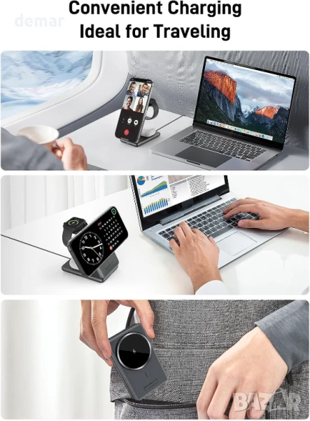Това сгъваемо 3-в-1 магнитно безжично зарядно устройство захранва едновременно вашия iPhone, Apple Watch и слушалки, което го прави идеално за споделена употреба или пътуване. То поддържа широка гама от устройства на Apple, с прецизно магнитно подравняване за зареждане както в портретен, така и в пейзажен режим. Поставката за Apple Watch разполага с бутон за лесно освобождаване за безпроблемна употреба, а интелигентният чип осигурява защита от презареждане, прегряване и късо съединение. Леко и компактно, то е подходящо за дома, офиса или за подарък.