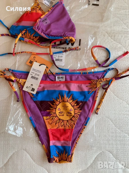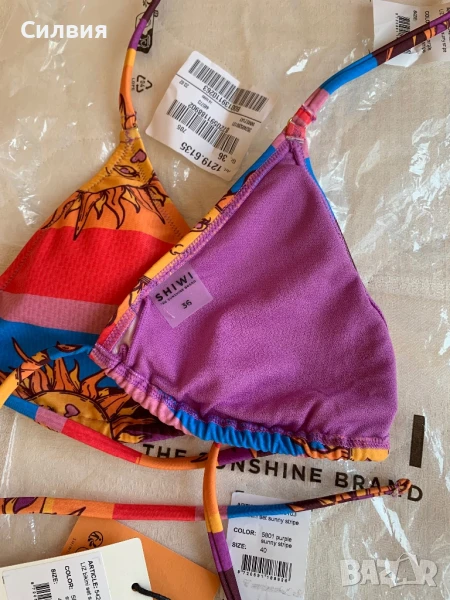 Дамски бански костюм SHIWI нов с етикети, долнището е размер 40, може да се регулира с връзките, горнището е размер 36 с леки свалящи се подплънки. Уникална материя, много приятна на допир. Цена 80 лева.