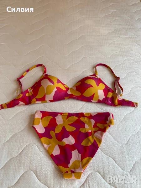 Мека и приятна материя. Горнището е с подплънки, които не се свалят, лята чашка е. Долнището е с две лица. Цена 60 лева.