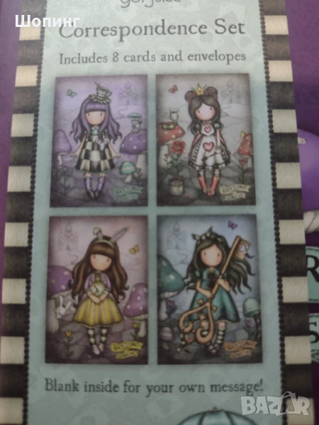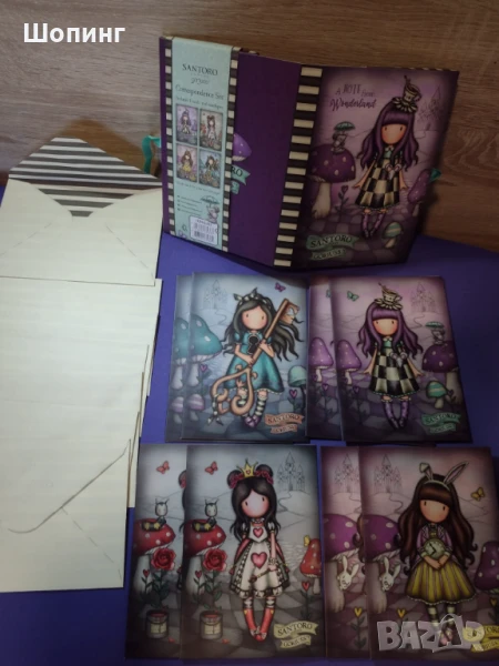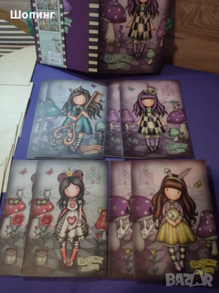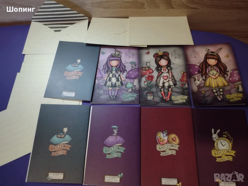 Картички Santoro - 4 вида по два броя налични и пликове Santoro. Цената на една картичка плюс плик е 3.50 лв. Можете да закупите за минимум 9 лв. общо в една доставка (към 6 лв.) По избор каквито картички пожелаете. Може по една от всеки вид с плик.