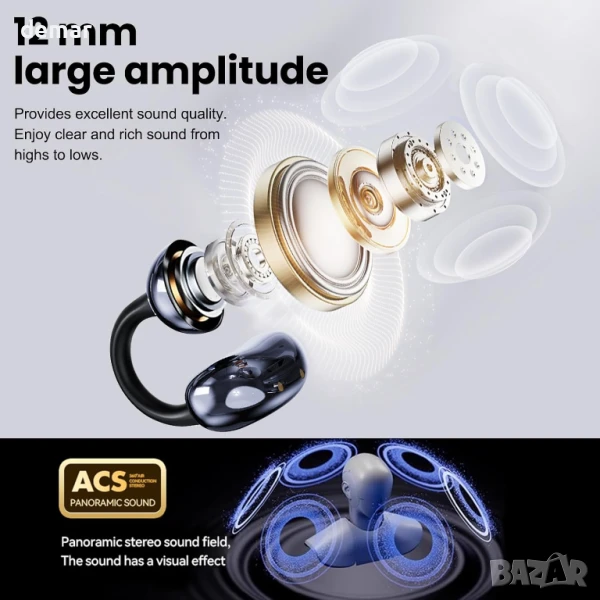 Ucani слушалки с отворени уши тип „щипка“, HiFi музика 360°, 65 часа, за iOS и Android, черни