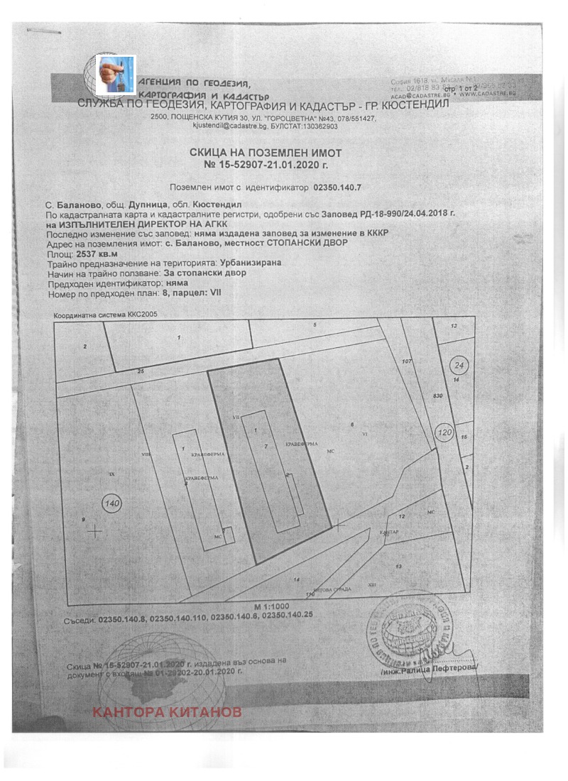 Предлагаме за продажба сграда от 523м2 и помощна постройка към нея от 48м2 построени върху прилежащ терен от 2537 кв.м в урбанизирана територия, находящ се в м. СТОПАНСКИ ДВОР на с.Баланово, общ. Дупница. Сградата е позиционирана между два пътя. Разполага с 3 вход/изхода по един към двата пътя и един страничен. Целогодишен достъп по асфалтов път.